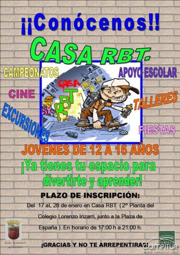 Actualmente se encuentra abierto el plazo para formalizar las inscripciones para participar en Casa RBT, las cuales deberán de ser presentadas en la segunda planta del Colegio Lorenzo Irisarri, ubicado junto a la Plaza de Abasto, en horario de cinco a nueve de la tarde o llamando al número de teléfono 607117710, hasta el próximo viernes 28 de enero.