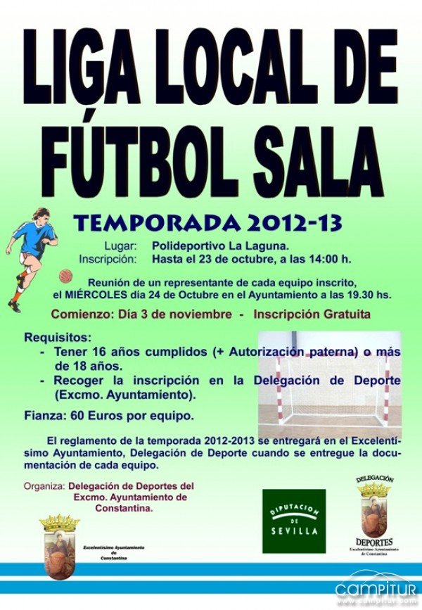 Desde la Delegación de Deportes del Ayuntamiento de Constantina informan a todos los posibles interesados de que el plazo para inscribirse en la Liga Local de Fútbol – Sala de Constantina 2012/2013, permanecerá abierto hasta las 14:00 horas del martes, 23 de octubre.