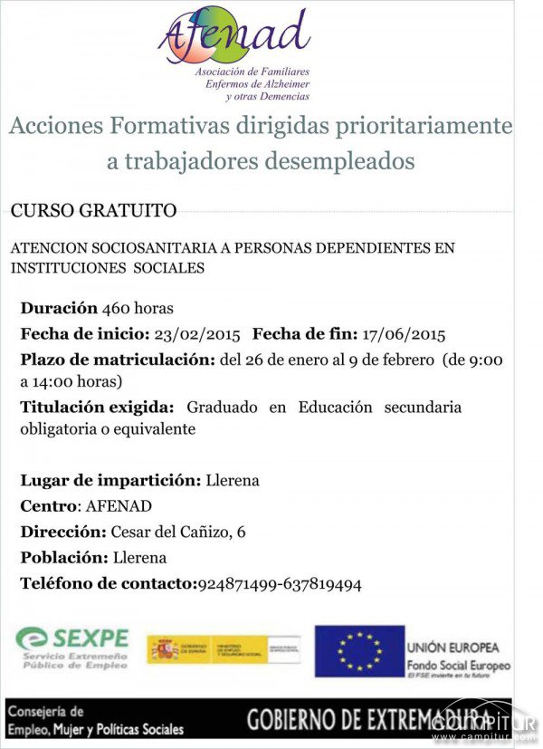 La Asociación de Familiares Enfermos de Alzheimer y otras Demencias de Llerena (AFENAD), pone en marcha la impartición de un curso gratuito con Certificado de profesionalidad de Atención Sociosanitaria a Personas Dependientes en Instituciones Sociales, dirigido prioritariamente a trabajadores desempleados.