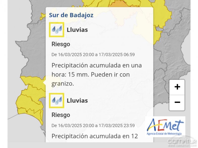 El sur de la provincia de Badajoz se encuentra este lunes, 17 de marzo, bajo aviso amarillo debido a la previsión de lluvias intensas, según ha informado la Agencia Estatal de Meteorología (Aemet).