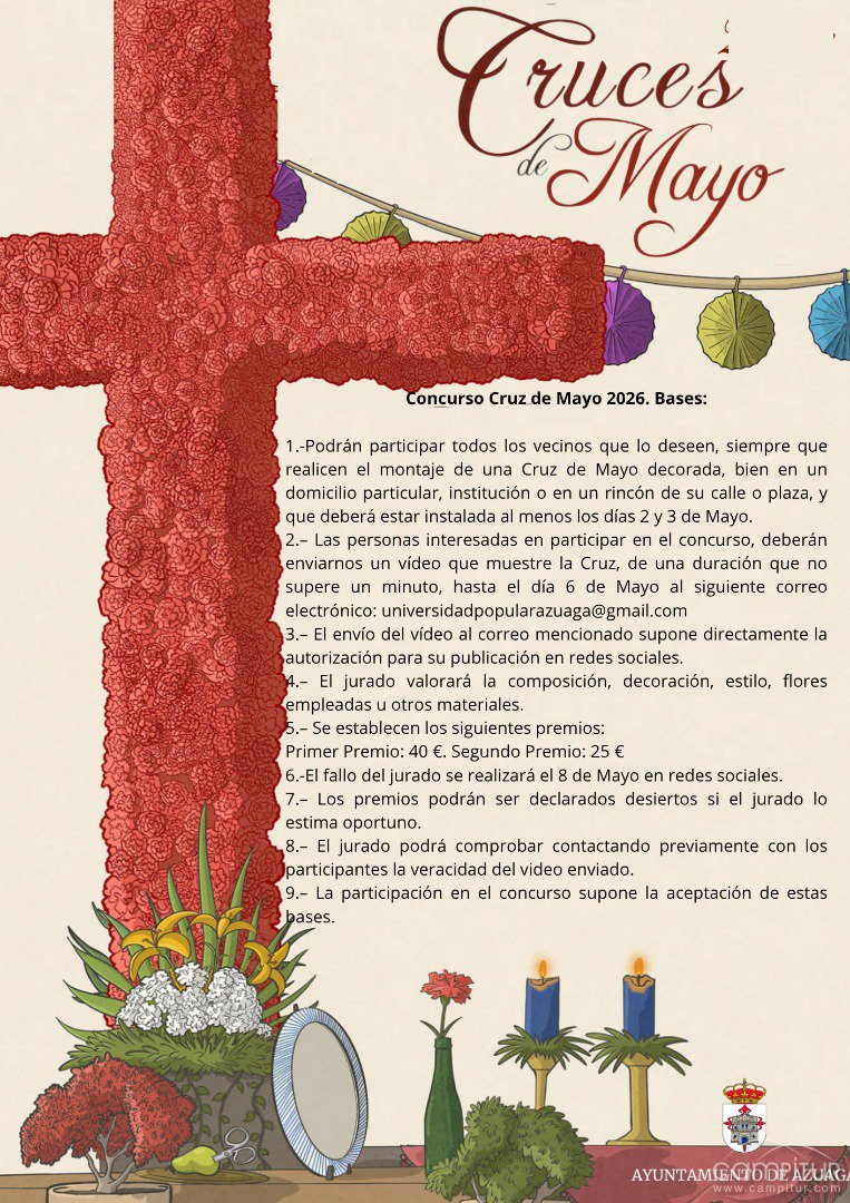 El Ayuntamiento de Azuaga ha dado a conocer las bases de varios concursos vinculados a la decoración tradicional y floral de cara al mes de mayo. La convocatoria incluye el Concurso de Cruz de Mayo 2026, así como los certámenes de Decoración Floral de Fachadas 2026 y Decoración Floral de Patios 2026, con el objetivo de animar a vecinos y vecinas a participar en la ambientación de la localidad.
