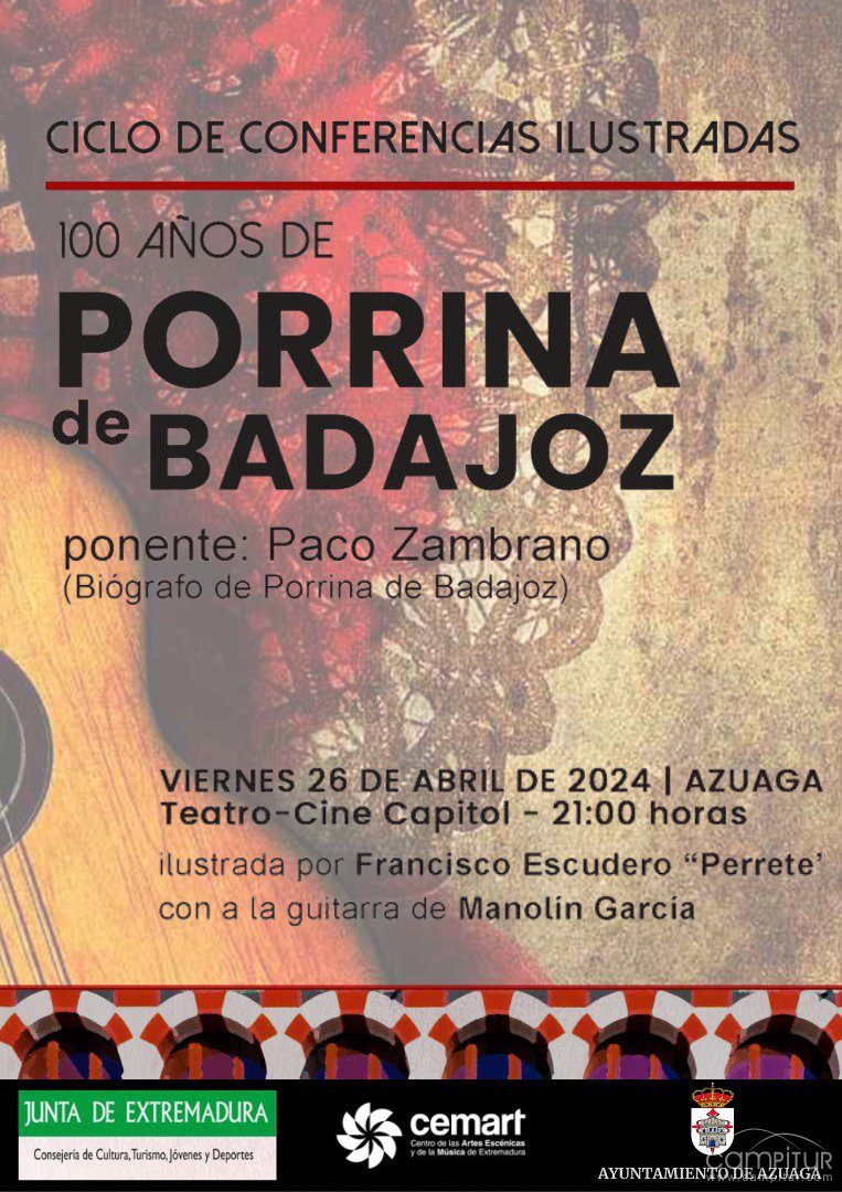 El próximo viernes 26 de abril, el ciclo de conferencias dedicadas a José Salazar Molina, conocido artísticamente como 'Porrina de Badajoz', hará escala en el Teatro Cine Capitol de Azuaga.