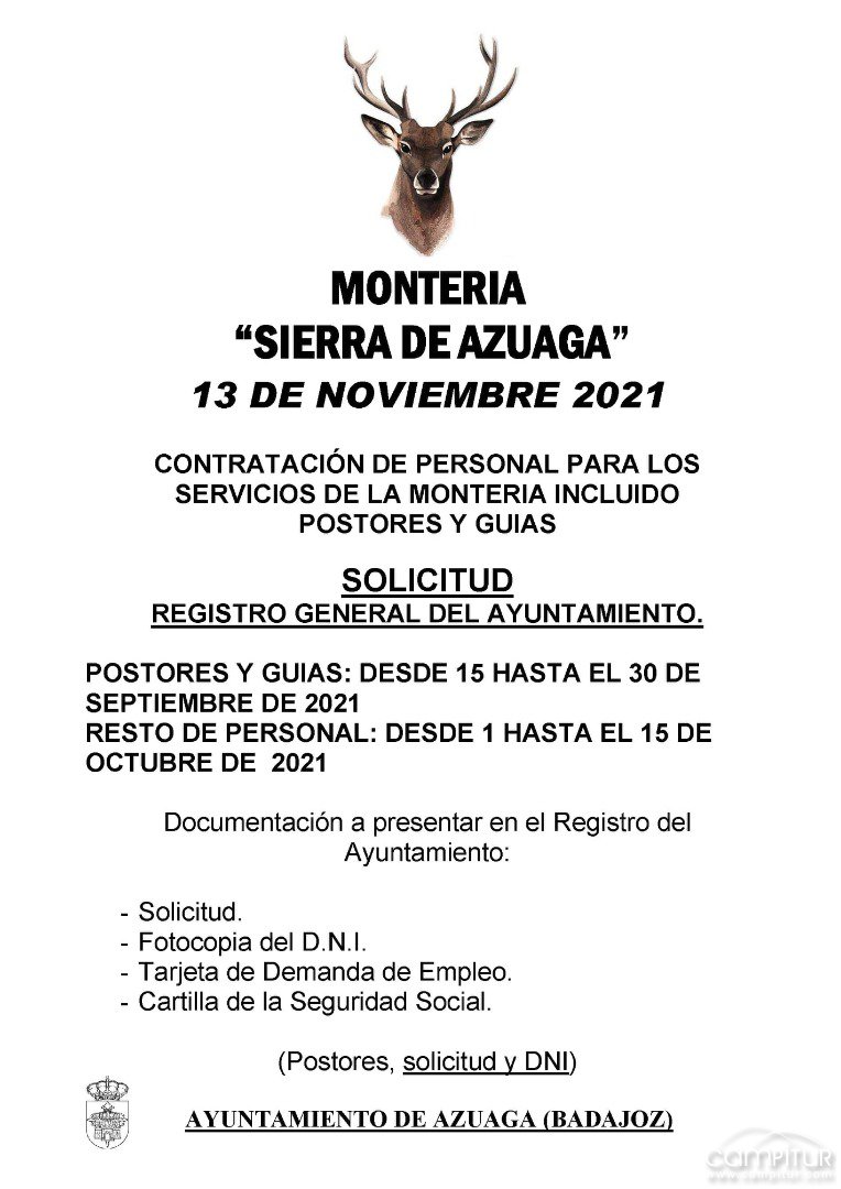 Con motivo de la próxima celebración de la Montería Sierra de Azuaga, el próximo 13 de noviembre, desde el Ayuntamiento de la localidad precisan contratar personal para los servicios de la montería, incluidos postores y guías.