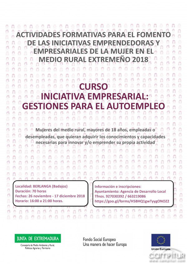 El Ayuntamiento de Berlanga informa de la próxima impartición del Curso “Iniciativa Empresarial: Gestiones para el Autoempleo”, en la localidad.