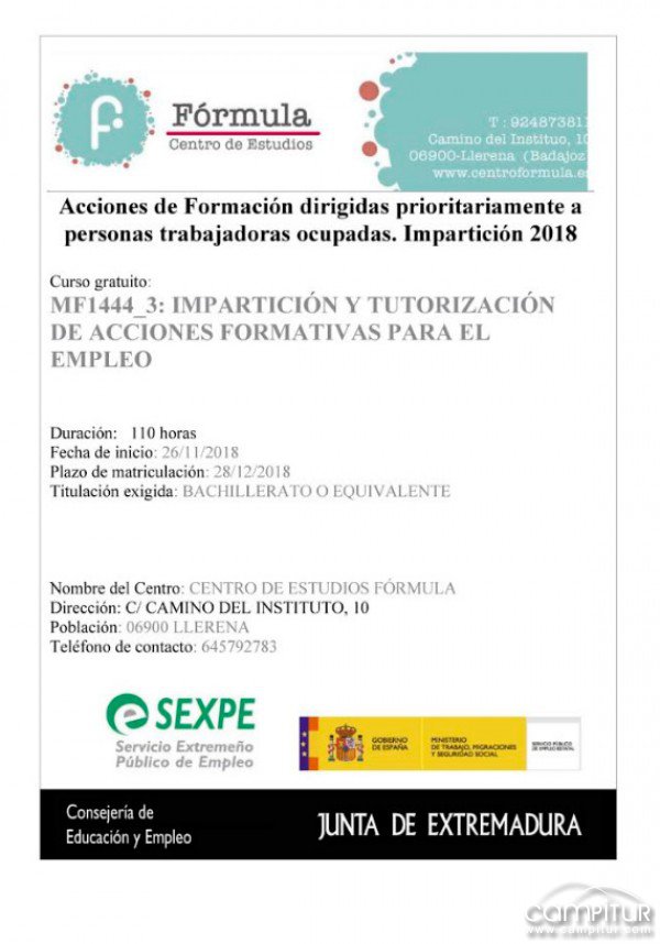 El SEXPE ha programado la impartición del Curso “Impartición y Tutorización de Acciones Formativas para el Empleo” en Llerena.