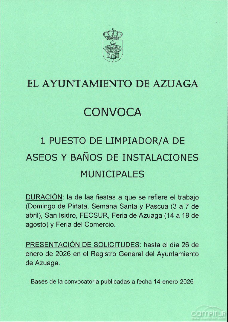 Según recogen las bases, el puesto está destinado a cubrir las necesidades de limpieza durante el Domingo de Piñata, Semana Santa y Pascua —del 3 al 7 de abril—, la festividad de San Isidro, FECSUR, la Feria de Azuaga, que se desarrollará del 14 al 19 de agosto, y la Feria del Comercio. El servicio consistirá exclusivamente en la limpieza y mantenimiento de baños y aseos de titularidad municipal durante el desarrollo de estos eventos.