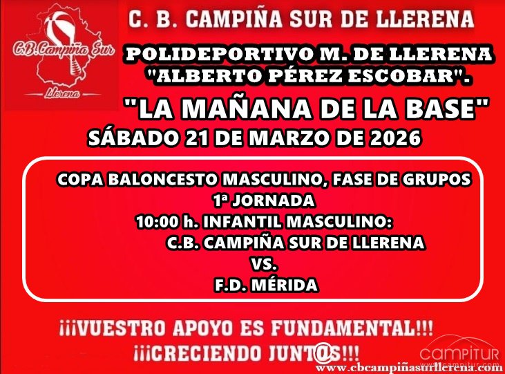 Además, el sábado 21 de marzo de 2026 se celebrará en Llerena “La mañana de la base”. En esta cita, el equipo infantil masculino jugará la 1.ª jornada de la fase de grupos de la Copa Baloncesto Masculino. Desde el club se espera el máximo apoyo de la afición, siempre desde el respeto y la deportividad, para llevar en volandas al equipo.