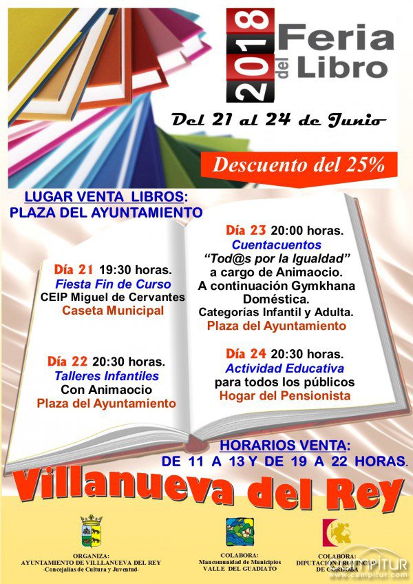 Del 21 al 24 de junio, Villanueva del Rey acoge su Feria del Libro 2018 en la Plaza del Ayuntamiento, donde poder adquirir todo tipo de ejemplares con un 25 % de descuento.