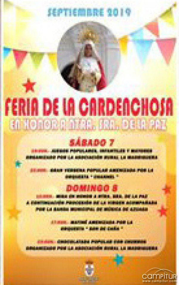 El próximo fin de semana, concretamente los días 7 y 8 de septiembre, como cada año, La Cardenchosa celebra su tradicional Feria en honor a Ntra. Sra. de la Paz.