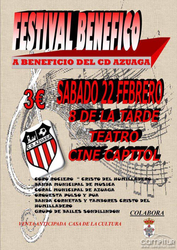 Mañana sábado, 22 de febrero, se llevará a cabo en Azuaga la celebración de un Festival Benéfico, cuya recaudación será donada al CD Azuaga, y en el cual participarán todas las agrupaciones musicales de la localidad.