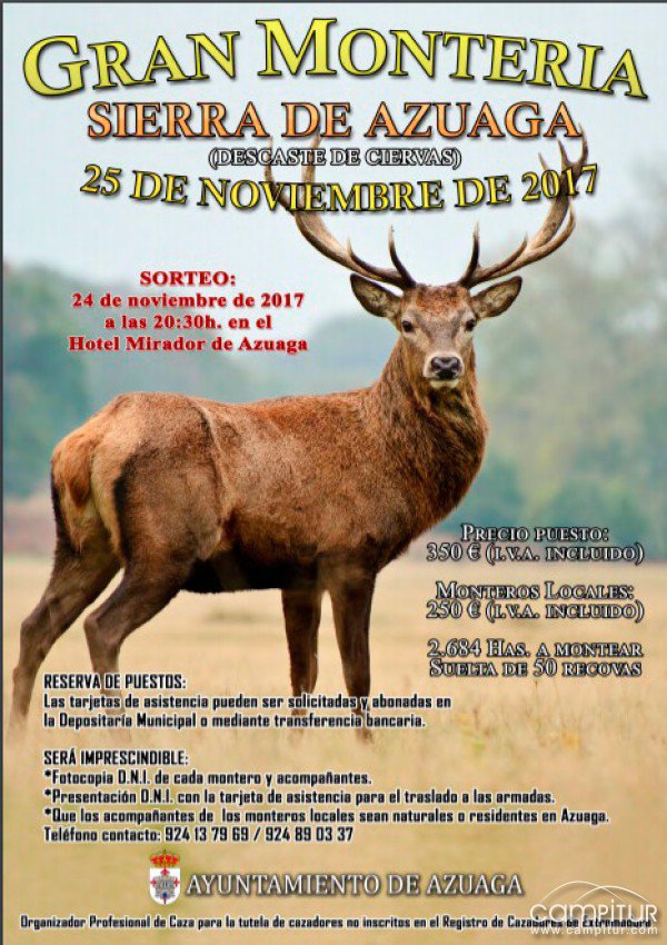 Azuaga acoge un año más la celebración de su Gran Montería Sierra de Azuaga, con el descaste de ciervas, que en esta ocasión se adelanta al mes de noviembre, más exactamente el evento se celebrará el sábado 25 de noviembre de 2017.