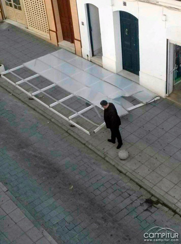 La cara menos amable de la jornada han sido los desperfectos causados por el temporal en algunas localidades de la provincia de Badajoz. En Azuaga por ejemplo, las fuertes rachas de viento han provocado la caída de un tejado de hierro y policarbonato de una terraza de una vivienda de la calle Muñoz Crespo. Afortunadamente cuando caía en la calle no pasaba nadie en ese momento, evitándose así daños mayores.