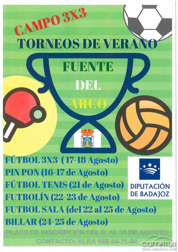 El Ayuntamiento de Fuente del Arco, con la colaboración de la Diputación de Badajoz, organiza la celebración de varios torneos deportivos en las siguientes disciplinas: Fútbol, Pin-pon, Futbolín, Fútbol-Sala, Billar.
