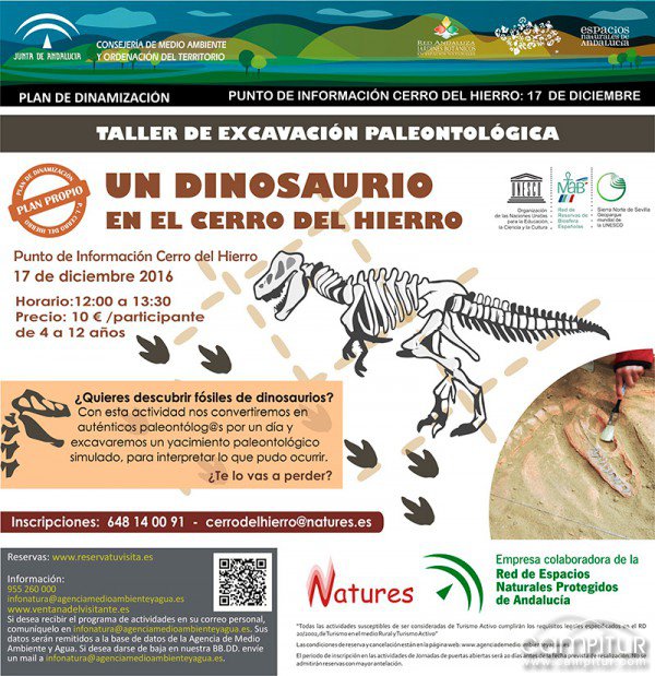 Dicha actividad se desarrollará en el Punto de Información Cerro del Hierro, el próximo sábado 17 de diciembre, a partir de las 12:00 horas, y durante la misma, los jóvenes participantes se convertirán como decíamos en paleontólogos, viéndose inmersos en un verdadero yacimiento paleontológico, creado para la ocasión. Mediante su trabajo en equipo, excavarán descubriendo verdaderos tesoros y entre todos deberán deducir qué fue lo que pudo ocurrir allí.