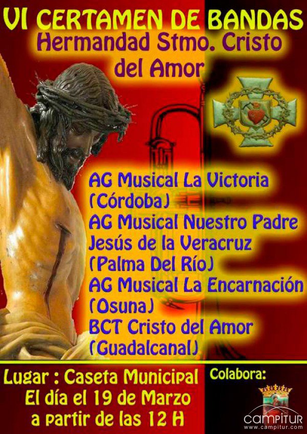 El domingo, 19 de marzo, Constantina acoge la celebración del VI Certamen de Bandas, Hermandad Santísimo Cristo del Amor, a partir de las 12:00 horas en la Caseta Municipal.