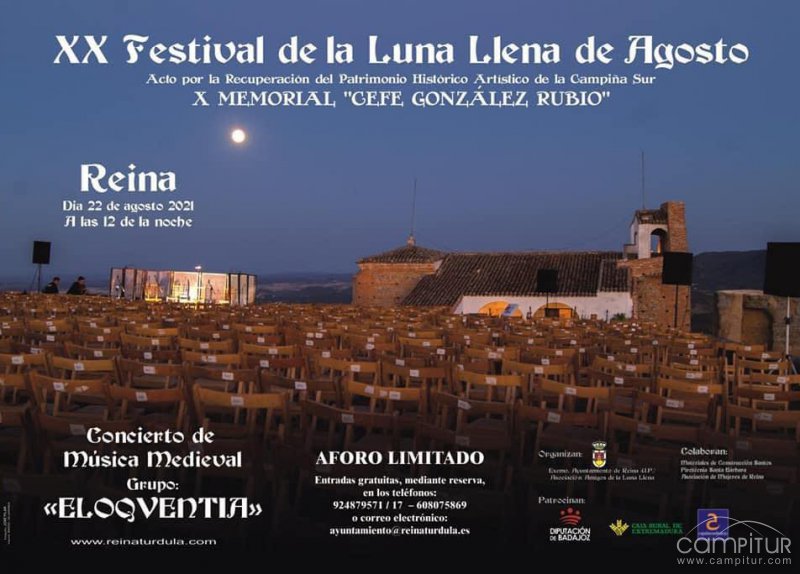 Un año más, el Ayuntamiento de Reina organiza en esta ocasión el XX Festival de la Luna Llena de Agosto. Acto por la Recuperación de Patrimonio Histórico Artístico de la Campiña Sur. X Memorial “Cefe González Rubio”.